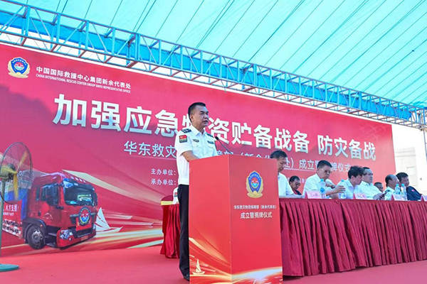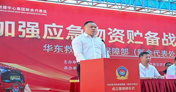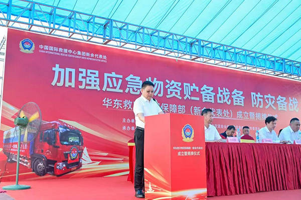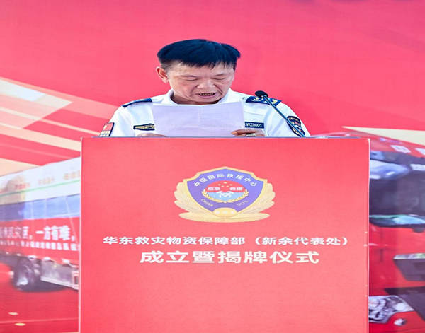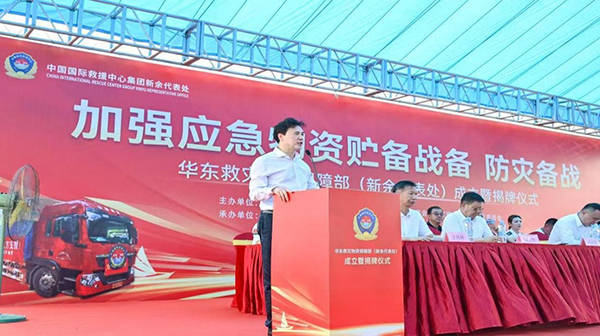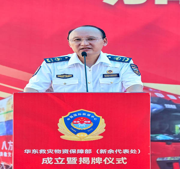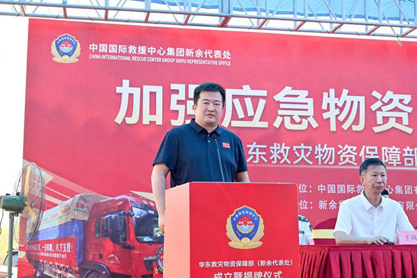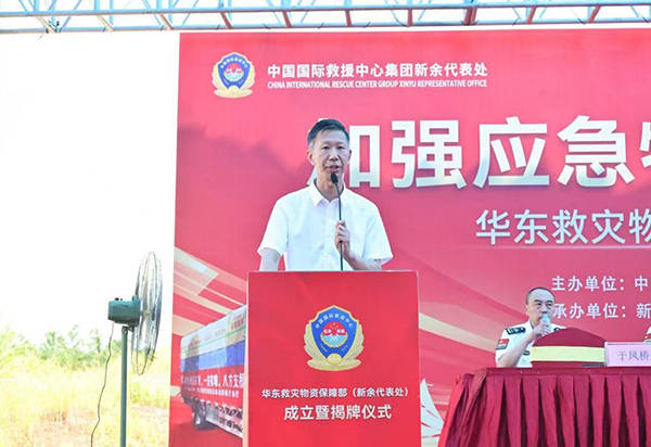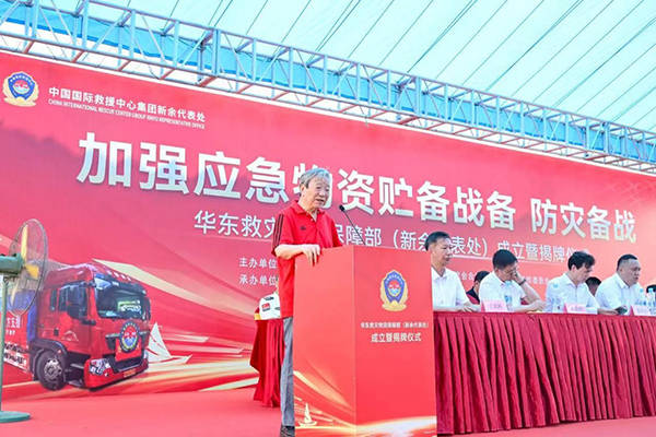 中国囯际救援中心(集团)董事局主席康海秀在华东应急救援物资保障部新余代表处成立既挂牌和授旗仪式上的致辞